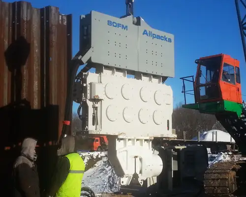 Вибропогружатель Allpacks 80FM имеет среднюю частоту колебаний. Отличается высокой степенью мощности и достаточно большим весом. Успешно применяется для погружения в грунт тяжелого корытного шпунта. Может быть использован и в тех случаях, когда необходимо выполнить погружение длинных шпунтин в грунт. Применяется при строительстве портов, обустройстве насыпей и т.д. В плотной городской застройке такой вибропогружатель лучше не использовать, так как производимые вибрации могут нанести серьезные повреждения близлежащим строениям.